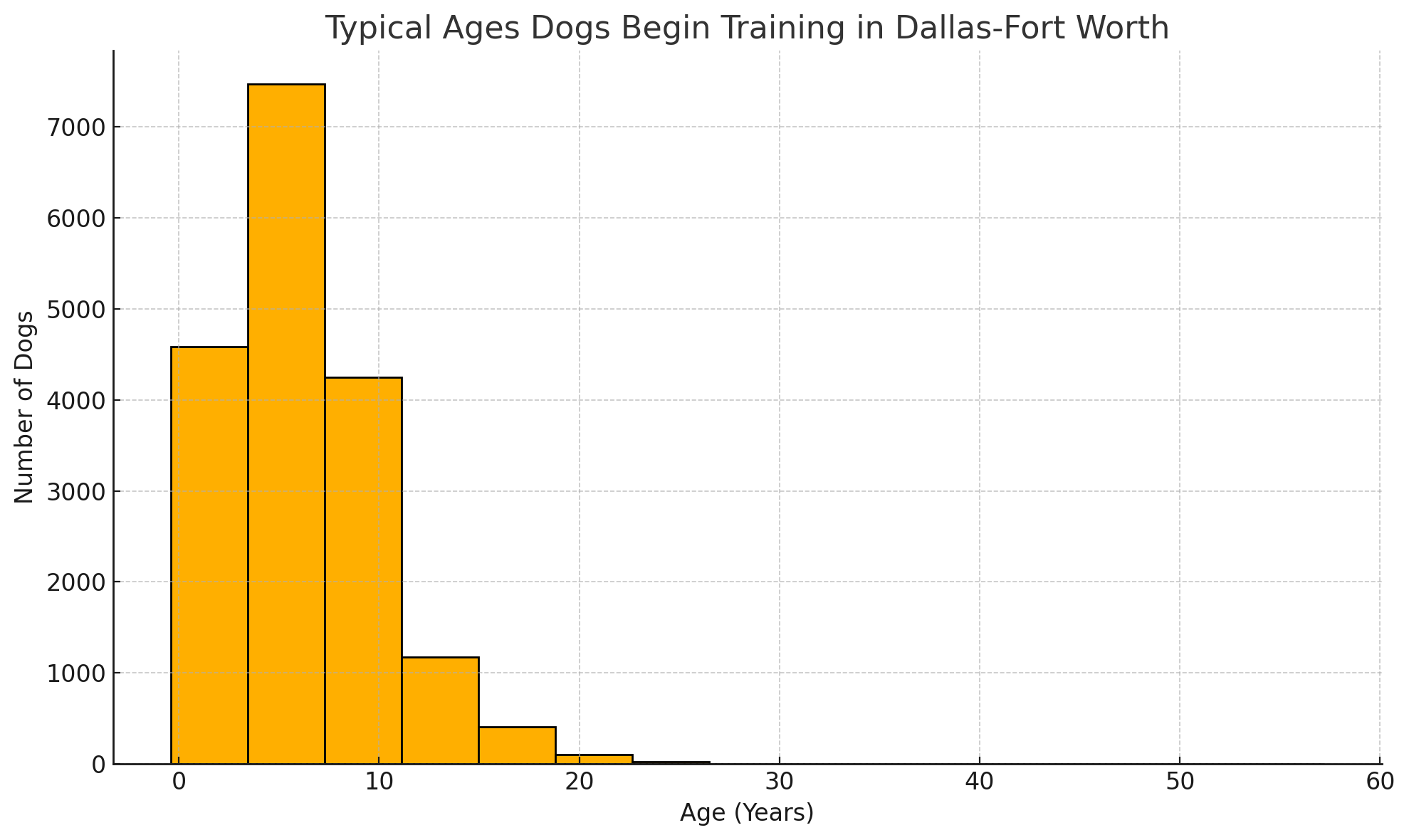 This histogram reflects our Dallas-Fort Worth training population. The largest age group for enrollment is 4–6 months, and nearly all puppies begin training before the age of 1. This supports our belief that early socialization, basic obedience, and a consistent puppy training schedule are the key to raising a confident adult dog.